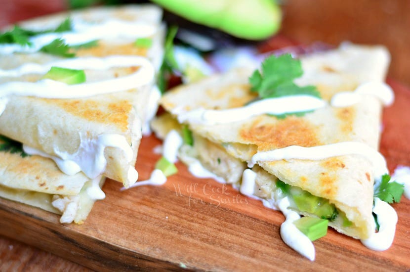 This is such a delicious quesadilla and it’s actually inspired by something I tried a couple of weeks ago. It’s made with juicy chicken that was sauteed with lime juice, creamy Monterrey Jack cheese, ripe avocado and fresh cilantro. The flavors in here will please your taste buds as you enjoy every single bite and then crave some more after you finish! (More a spicy kick, add some chopped jalapeno pepper!)