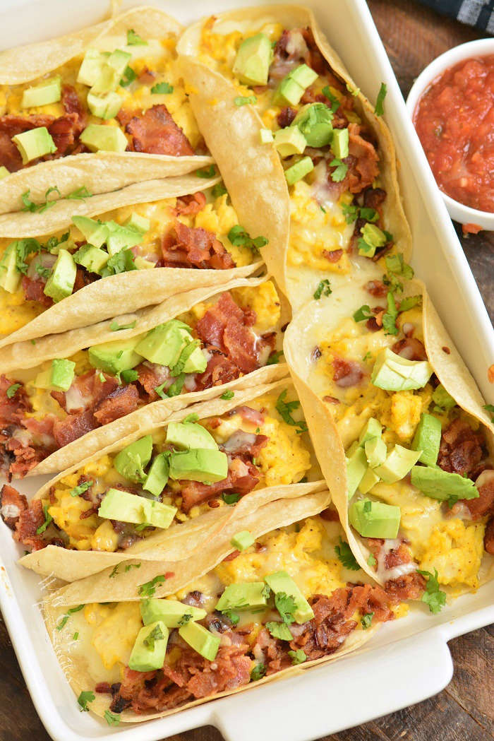 Breakfast tacos make a wonderful family breakfast or a holiday brunch. Fill tortillas with soft, fluffy eggs, crispy bacon, gooey cheese, and bake it for a few minutes. Salsa and avocados make the perfect topping for these tacos but there are many more options to try.