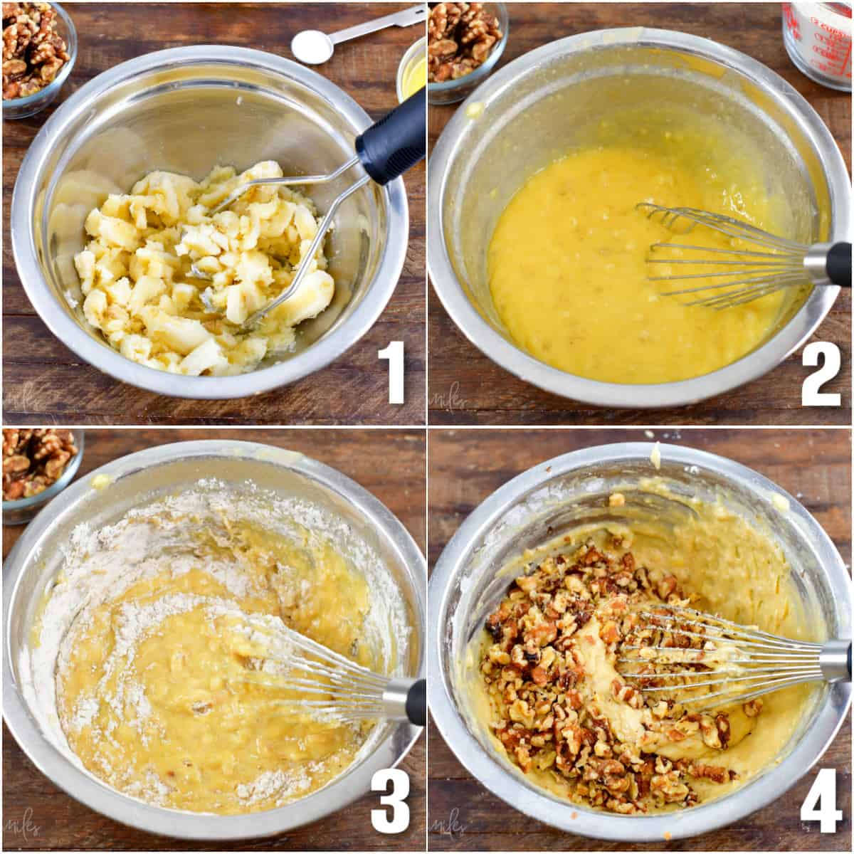 - Mash bananas with a fork in a large mixing bowl. Leave a few little lumps.