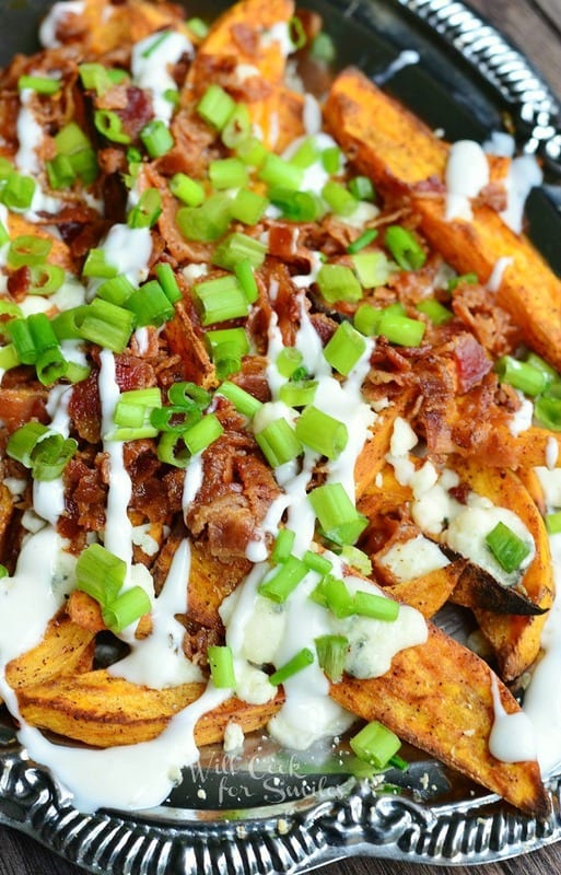 Amazing and easy dinner to serve to your special lady on Mother’s Day. Tender Kobe filet mignon served with a side of roasted sweet potato wedges loaded with blue cheese crumbles, crispy bacon bits, scallions, and drizzles with ranch dressing.