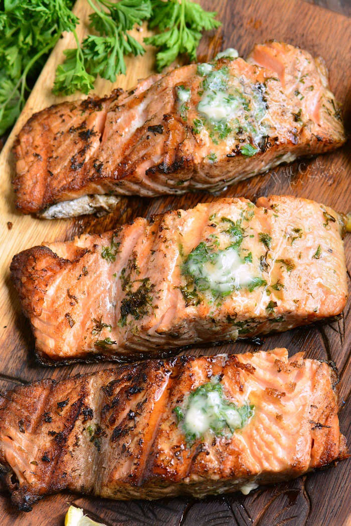 three grilled salmon filets topped with garlic butter on the wooden plate.