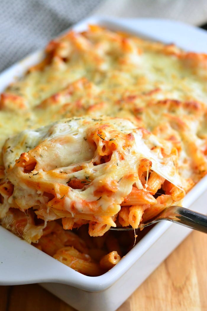 This delicious baked penne is made with an easy homemade spaghetti sauce. The sauce might be homemade but it’s truly very easy. It can also be made ahead of time, which is a great.