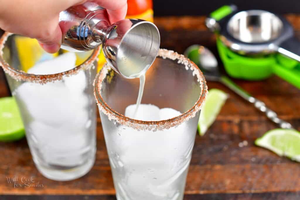 Rub the rim of each glass with a lime wedge, then dip the rim into the seasoning. Feel free to coat it pretty liberally – it’s really delicious!