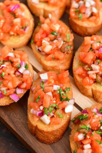 Cold appetizers are wonderful because you can make them ahead of time and you don’t have to worry about keeping them warm during the party. These include the cheese balls, cold pinwheels, cold dips, charcuterie boards, and other cheese and vegetables platters.