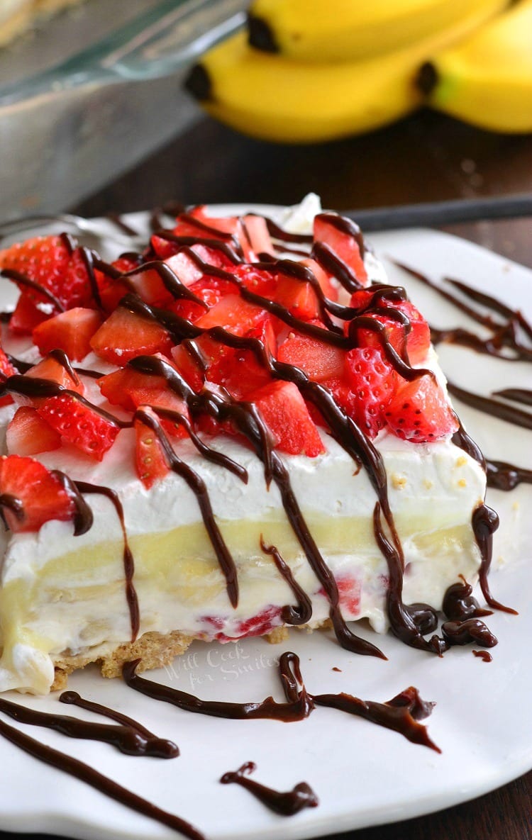 Heavenly no-bake cheesecake dessert that hold all the delicious banana split flavors in it. Layers of graham cracker crumbs, strawberry and banana filled smooth cheesecake, banana pudding, and whipped topping.
