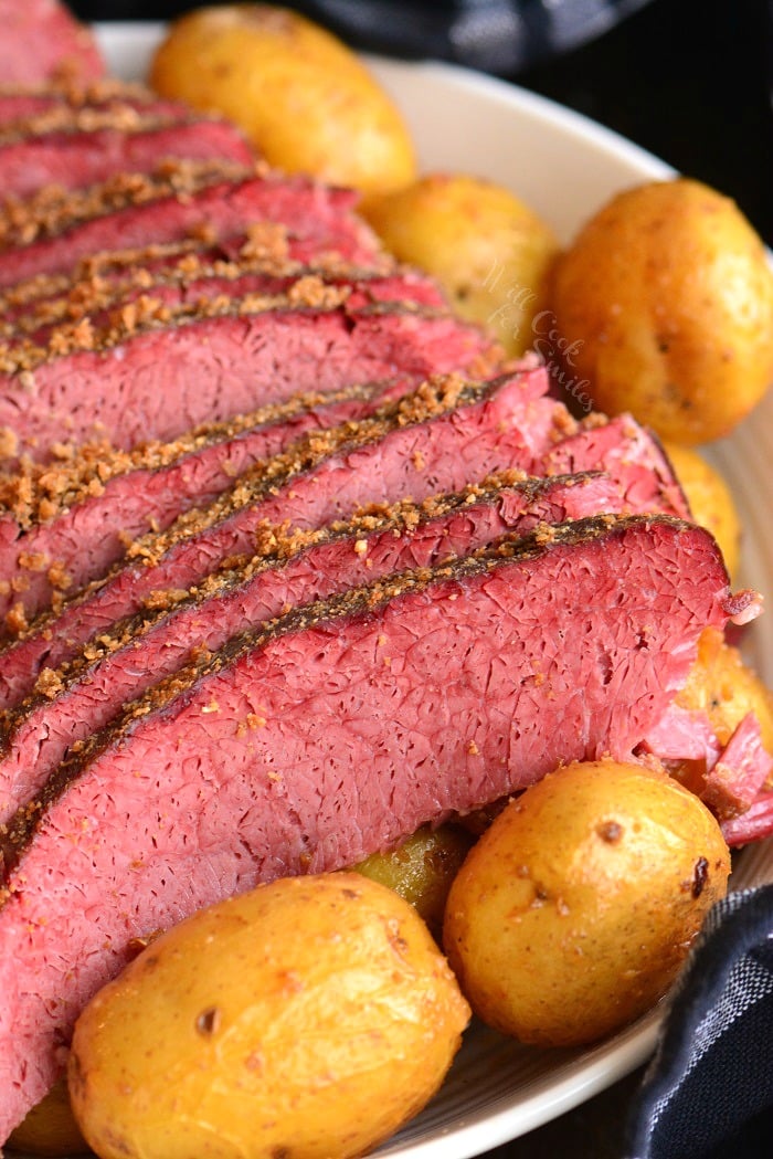 - Cut corned beef against the grain and serve with potatoes, onions, and some of the cooking juices.