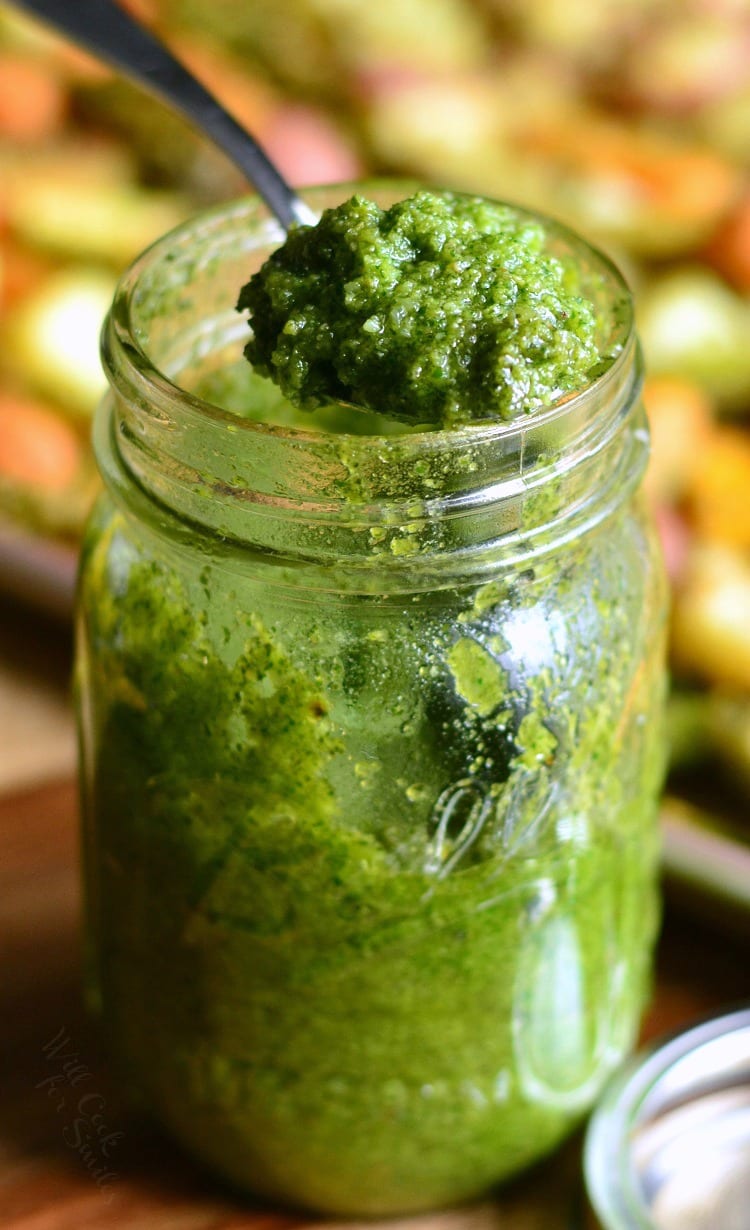 In addition to the roasted vegetables recipe, I also added the recipe for homemade pesto. It’s nice to have a batch of homemade pesto in the fridge to use on sandwiches, pasta, pizza, or just dipping some bread in it. This pesto recipe makes about 2 cups. Obviously you won’t be using the whole batch of pesto on the veggies, there will be a good amount of pesto leftover. Of course, if you don’t feel like making pesto, grab your favorite one at the store and this roasted potato side will be a breeze.