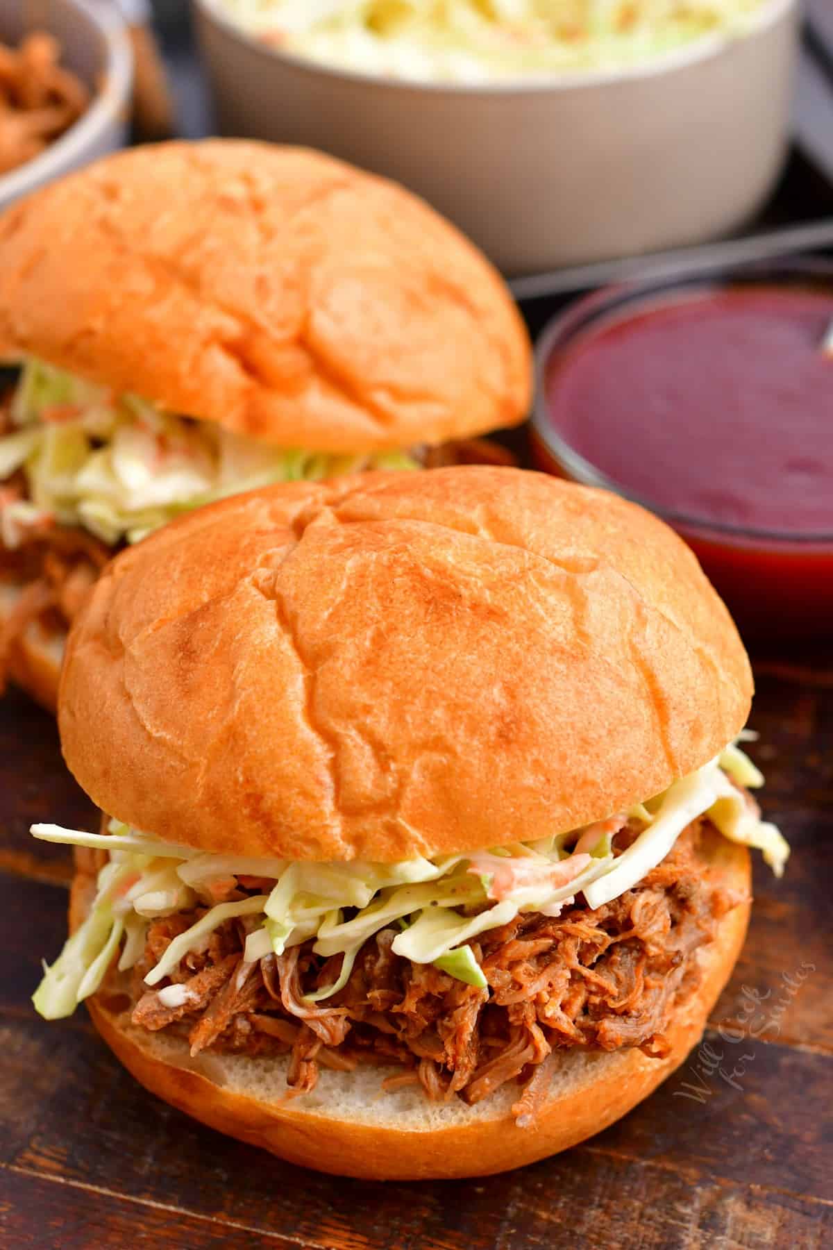 The best advice I can give you is to not assemble the sandwiches until you’re ready to serve them! The coleslaw, barbecue sauce, and even the pork will seep into the bun and make them soggy if made too far in advance.