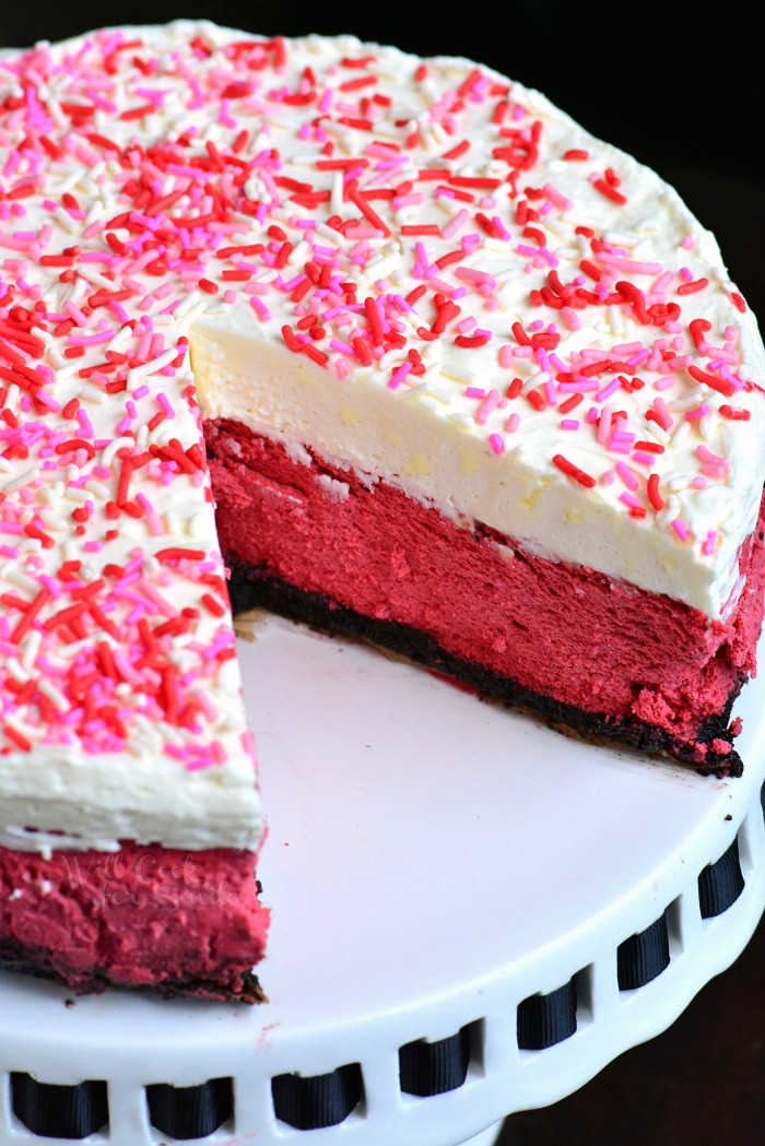 This cheesecake combines all those traditional ingredients like cocoa powder, buttermilk, vinegar into a smooth and rich dessert. It’s also frosted with a tasty cream cheese frosting.
