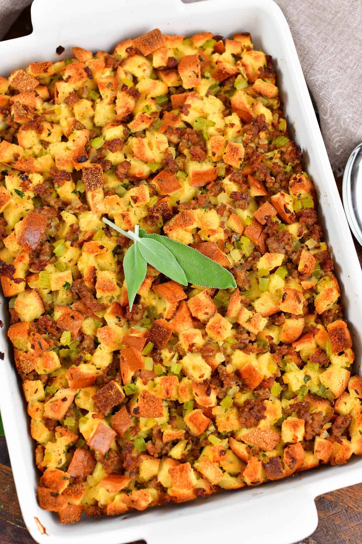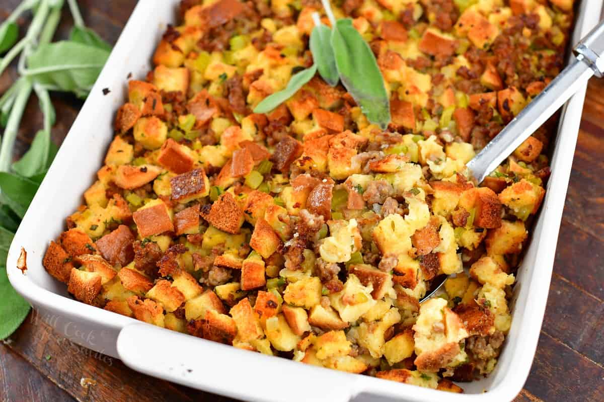 This classic sausage stuffing features staled Italian bread, flavorful mild Italian sausage, and fresh herbs like sage, thyme, and parsley. This is a great holiday side dish that the whole family will love!