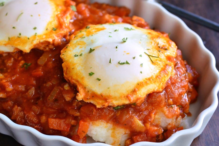 This is exactly the way I serve my shakshuka – over Parmesan polenta. The creamy polenta really plays well with the spices of the shakshuka. I have made this as is and it is delish. I do normally cut my veggies into thin strips. Just a preference.