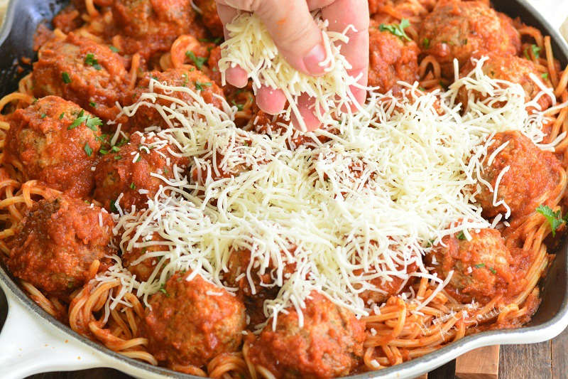 - Nestle meatballs into the spaghetti and top everything off with shredded cheese and a sprinkle of oregano.