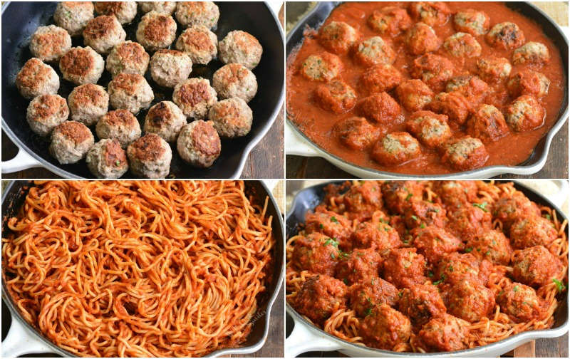 - Take meatballs out of the pan but leave the sauce. Add spaghetti to the pan with sauce and mix well to coat all the pasta with sauce.