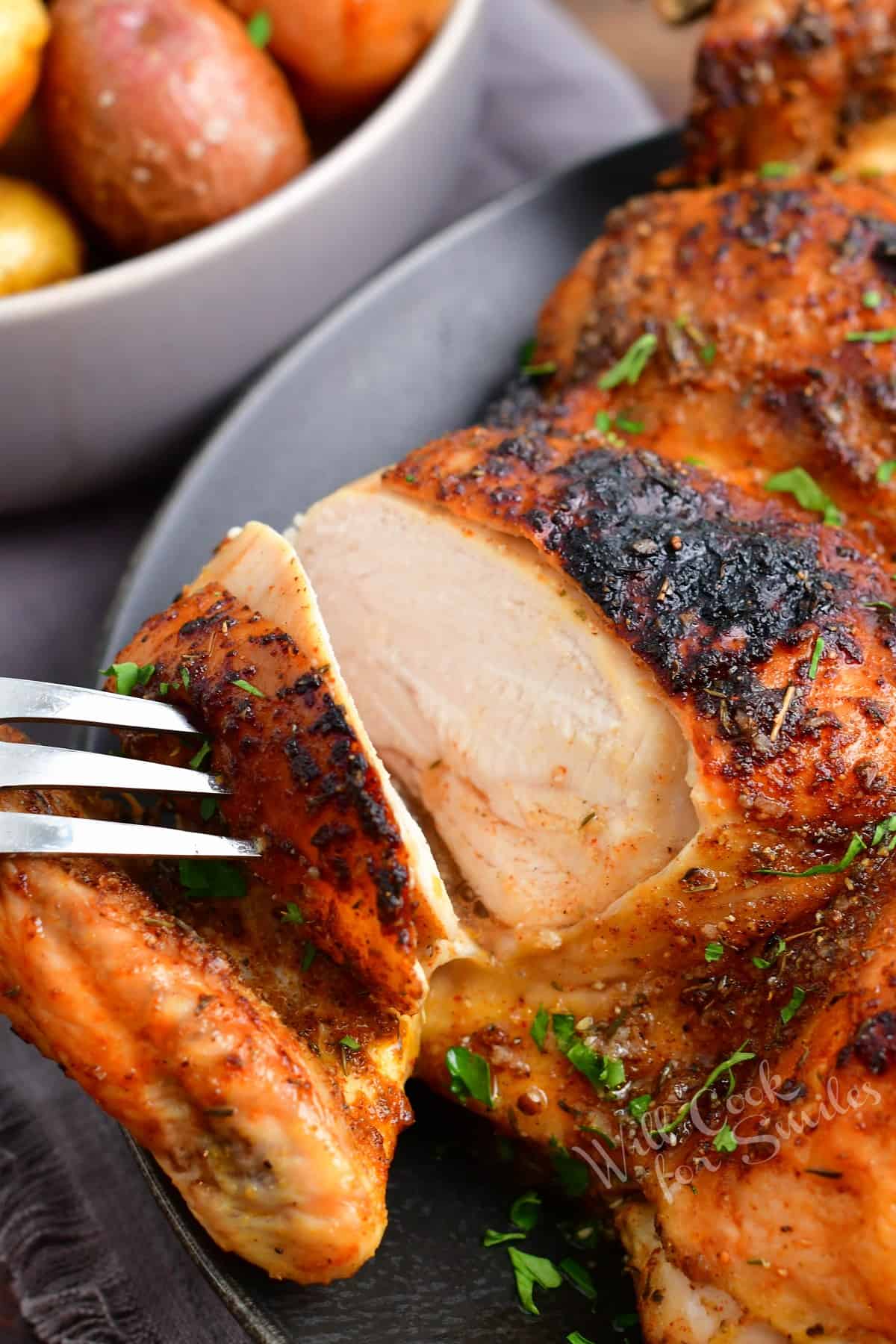 It’s the most certain way to make sure the meat is fully cooked. Remember to inserted the probe into the thickest part of the meat, fully cooked chicken that’s safe to eat should be 165°F.