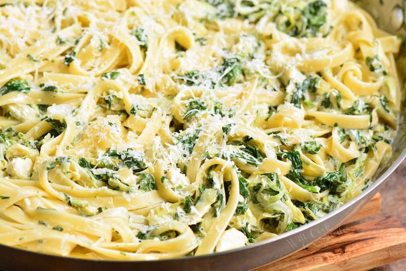 This creamy fettuccine recipe is super easy and comforting. Classic spinach artichoke dip flavors are perfect to turn into a sauce for your favorite pasta. Make it meatless or add some protein like chicken, shrimp, or salmon.