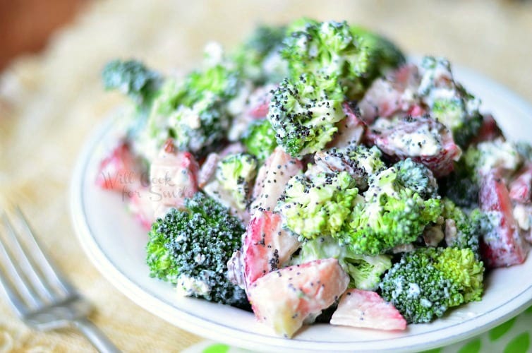 Beautiful summer salad that will make a perfect addition to any barbecue! This Strawberry Broccoli Salad is made with fresh broccoli, strawberries, goat cheese, sweet Greek yogurt dressing and topped with poppy seeds.