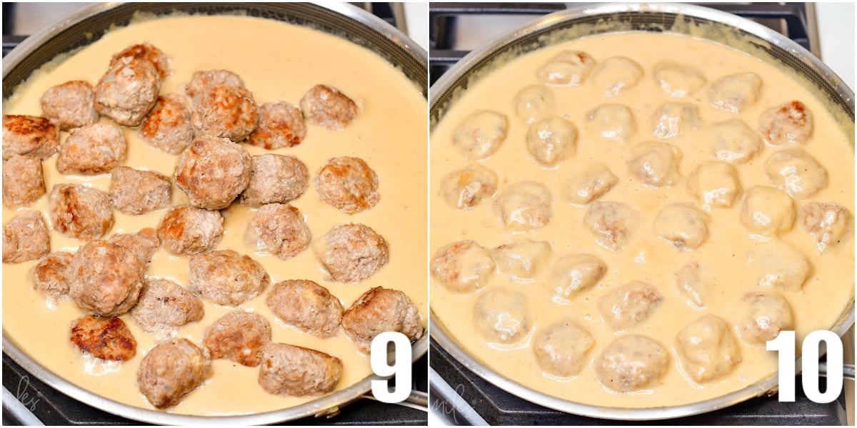 Add the meatballs to the pan. Once the sauce starts to thicken, add meatballs back in and simmer everything together for a few minutes (9, 10).