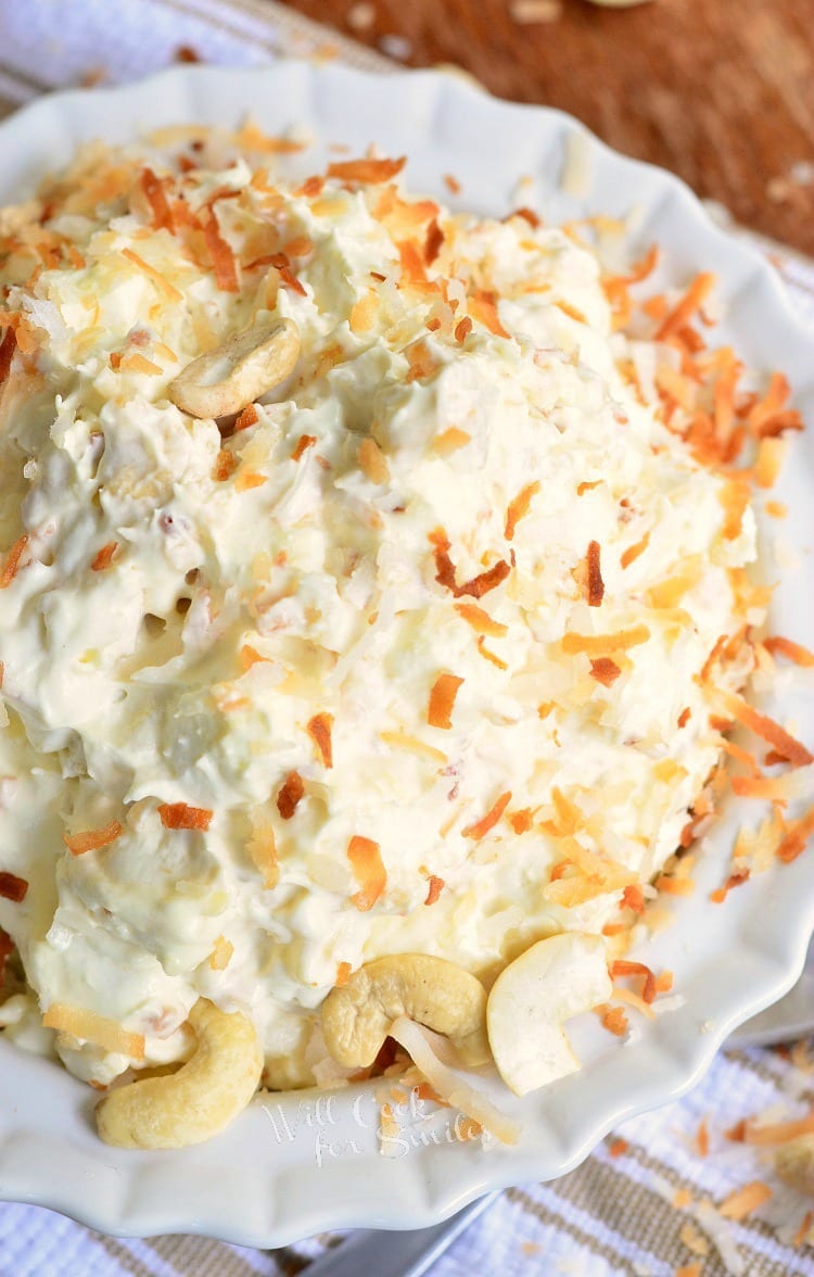 This fluff salad is simply divine. It’s smooth, it’s creamy, it’s silky, and it’s packed with exotic flavors of toasted coconut and cashews. Imagine sitting on a coconut cloud and eating it, that’s pretty much what it’s like to eat this salad. Cashews provide a soft crunch and a powerful flavor addition. Toasted coconut really needs no explanation, it’s always an amazing flavor.