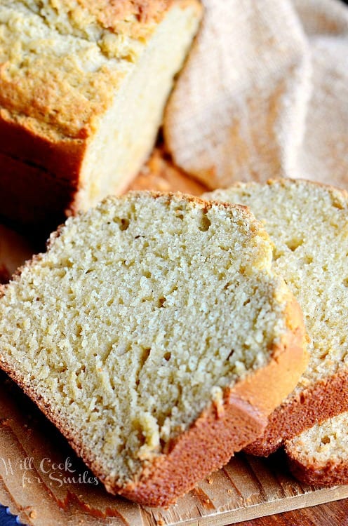 I’m starting with this incredibly delicious eggnog bread! My husband looks forward to the holiday season for the presents and the eggnog. The man seriously loves eggnog so I got him some. I have never tried straight eggnog and I don’t think that I will. I do like the flavor in baked goods but I just can’t get my head around the raw egg part in a drink. So even though I don’t drink it myself, I like baking with it. Eggnog Pancakes and waffles rock too!