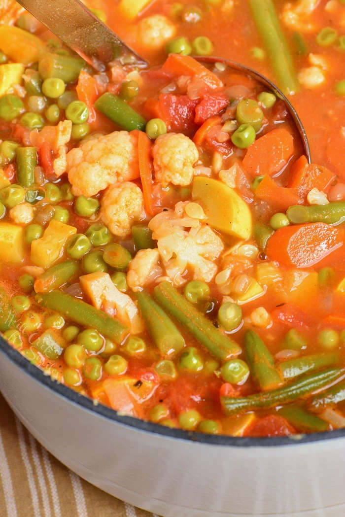 Vegetable soup is just as simple as advertised, it’s a delicious hearty soup that’s packed with different vegetables. The soup takes about as long to cook as the vegetables that are in it. Most of the work goes into cutting the vegetables and after that, it’s just adding them to the pot.