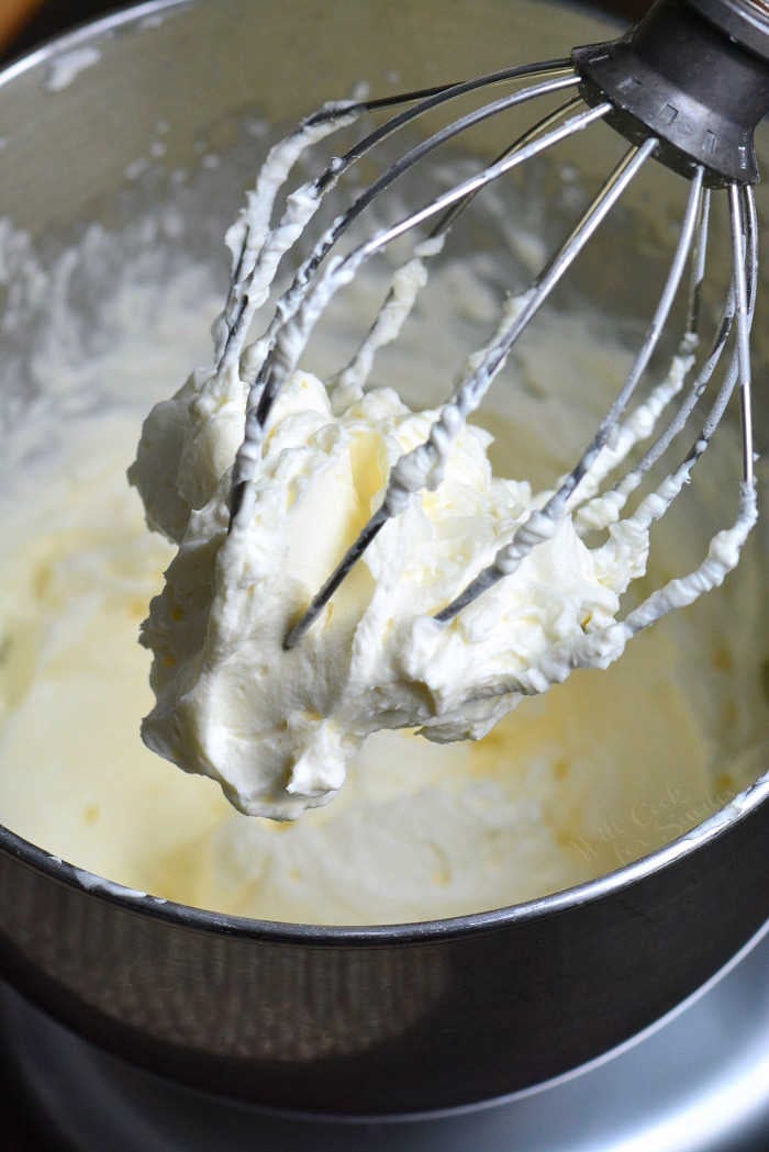 Step 1: Using your whisk attachment, start beating the room temperature cream cheese on medium-high speed.