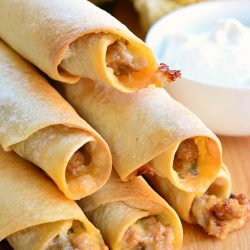 To roll taquitos: lay a raw tortilla on a board, spread about 2 tablespoons of sausage filling on the lower end of tortilla in a thin line. Starting with the lower edge, roll up tortilla tight and place it on a greased baking sheet, seem down. Repeat with remaining tortillas. Place rolled taquitos about an inch apart.