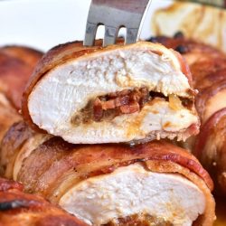 Easy chicken dinner with only 4 ingredients. Inside, this chicken is stuffed with a mixture of onions sauteed with bacon and BBQ sauce and outside, the chicken is slathered with more BBQ sauce and wrapped in bacon.
