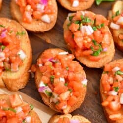 Make Ahead: You can make the bread and leave it on the counter, uncovered for several hours or up to a day. If you need to crisp them back up, just pop them in the oven for a couple of minutes at 425°F. You can make the topping ahead of time just as easily and store it in the refrigerator, in an air-tight food storage container. Tomato topping can be make up to 2 days in advance. Just note that there will be excess liquid, you can strain it off or just scoop out tomatoes with a slotted spoon.