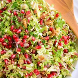 This beautiful winter salad is made with shaved Brussels sprouts, pomegranate seeds, pecans, Gorgonzola, shallots, and of course, bacon. It’s all tossed with Mustard Vinaigrette, which is a great compliment to the salad.