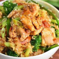 Add cooked rice to the chicken and vegetables pan and carefully mix everything together until evenly combined. Top off with some sesame seeds and scallions of you wish and serve.