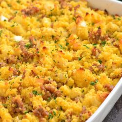 Delicious, moist cornbread dressing recipe made with the addition of spicy Italian sausage and apples. Dressing always tastes the best when using homemade buttermilk cornbread and there are always options to make it ahead of time.