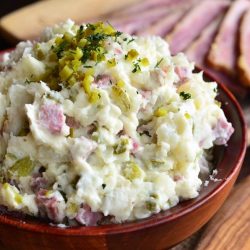 Delicious creamy potato salad made with tender corned beef brisket, crunchy dill pickles, dill weed, mayonnaise, sour cream, and Dijon mustard. It's a great way to use leftover corned beef.