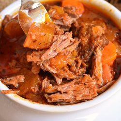 Crock Pot Roast with pumpkin is a perfect seasonal twist on on a classic comfort dinner. Tender roast made in a slow cooker with fresh pumpkin, carrots, onions, and flavorful tomato based gravy.
