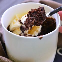 Pour the batter into a mug that can hold 8 oz of liquid (don't make mug too big either.) Drop 1 Tbsp Nutella in the center.