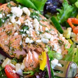 Delicious and healthy Mediterranean salad topped with juicy baked salmon.