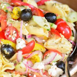 Make Ahead Suggestions: I actually highly encourage making this salad ahead of time! Making Greek tortellini salad ahead of time will actually give all ingredients time to marinate together and infuse pasta with delicious flavors. Prepare tortellini salad according to the recipe and store it in an airtight container in the refrigerator. You can make it up to 1 day ahead of time for the freshest results. Make sure to stir it well before refrigerator and before serving to that the dressing is spread evenly throughout.