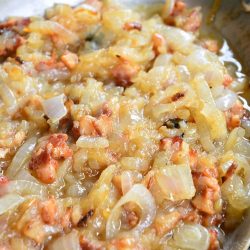 Once bacon is ready, add onion to the pan and gently mix until onions are evenly coated.