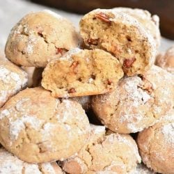 Use a cookie scoop to get even cookies. (I use either #50 or #40 cookie scoop.) Gently roll the dough into a ball and drop it into the bowl with powdered sugar. Roll the ball in sugar and place it on the prepared baking sheet.