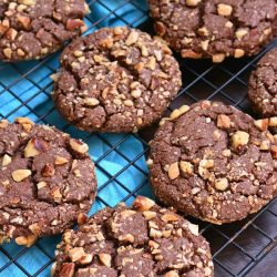 Soft chocolate cookies made with a generous helping of Nutella in the batter and coated with crushed hazelnuts. (Cookie dough needs to be refrigerated before baking.)