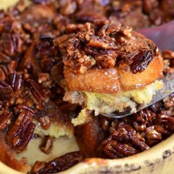 Sweet, nutty, comforting French Toast Breakfast Casserole made to taste just like the holiday favorite pecan pie.