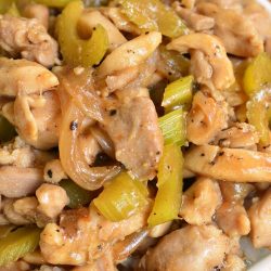 Juicy, tender chicken thigh meat is sauteed with onions and celery and cooked in black pepper soy sauce. Serve it with rice, quinoa, farro, or cauliflower rice.