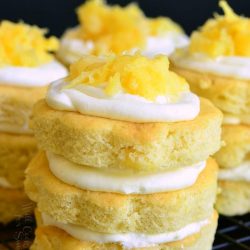 Soft, moist pineapple cake made with fluffy cream cheese frosting and served as layered mini cakes.