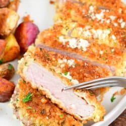 Note on when pork cutlets are done: to check for doneness, you can cut one of the pieces in the middle to see inside. Pork can (and should) be a pale pink color in the middle when done. As a matter of fact, pork will be very slightly pink in the center at 145°. Pork is done at 145° internal temperature but it's hard to take the temperature when the slices of meat are very thin. What you do not want is the pork that is completely turned white with no pink at all because it's well done at that point. Well done pork is when it turns chewy and tough.Gluten Free Notes: You can make these crispy pork cutlets gluten free very easily. All you need to do is use gluten free all purpose flour and gluten free Panko style bread crumbs to make gluten free pork cutlets!