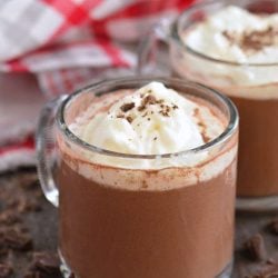 Divide hot chocolate among 2 mugs and serve it with some whipped cream on top.