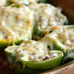 Bake peppers for 30 minutes. Add a slice of Pepper Jack cheese to each bell pepper and bake for a few more minutes.