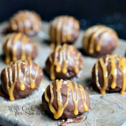 Once the chocolate is solidified, drizzle the truffles with caramel and sprinkle with coarse salt.