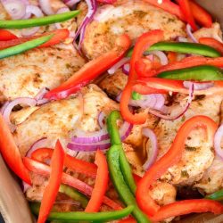 Slice peppers and onion thinly and spread about 2/3 of the veggies in the bottom of the casserole dish.