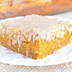 To make the glaze, add powder sugar sugar and cinnamon to a small bowl. Add warmed heavy cream and whisk until all smooth. Place glaze into a piping bag. Cut off a small tip off the piping bag when ready to glaze the cake and drizzle the cake with cinnamon glaze.