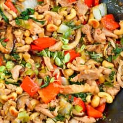 Gai Pad Med Mamuang, or Thai Cashew Chicken, is a flavorful and easy Thai chicken stir fry that features chicken, cashews, onions, bell peppers, shiitake mushrooms, bok choy, scallions, garlic and ginger. There is a signature pop of heat from Thai red chili peppers that's nicely balanced with a touch of sweetness in the stir fry sauce.
