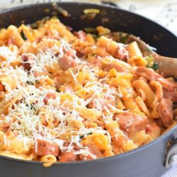 Pasta skillet made with sweet German smoked sausage, tomatoes, basil, leeks, and creamy sauce.